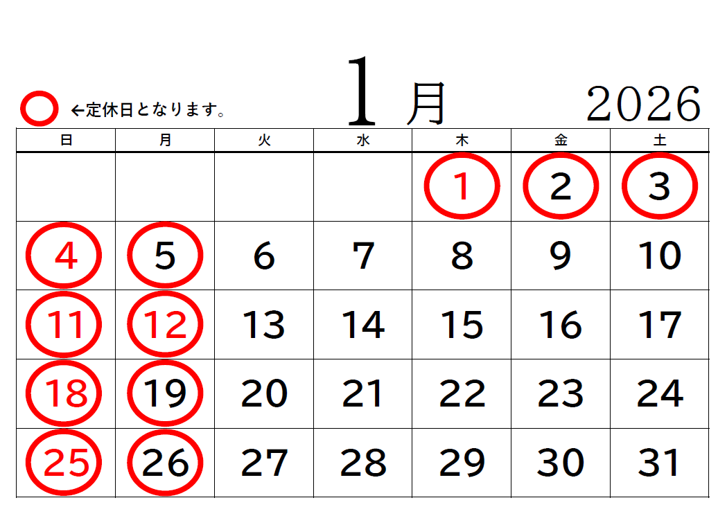 【2026年1月】の定休日をお知らせ致します。