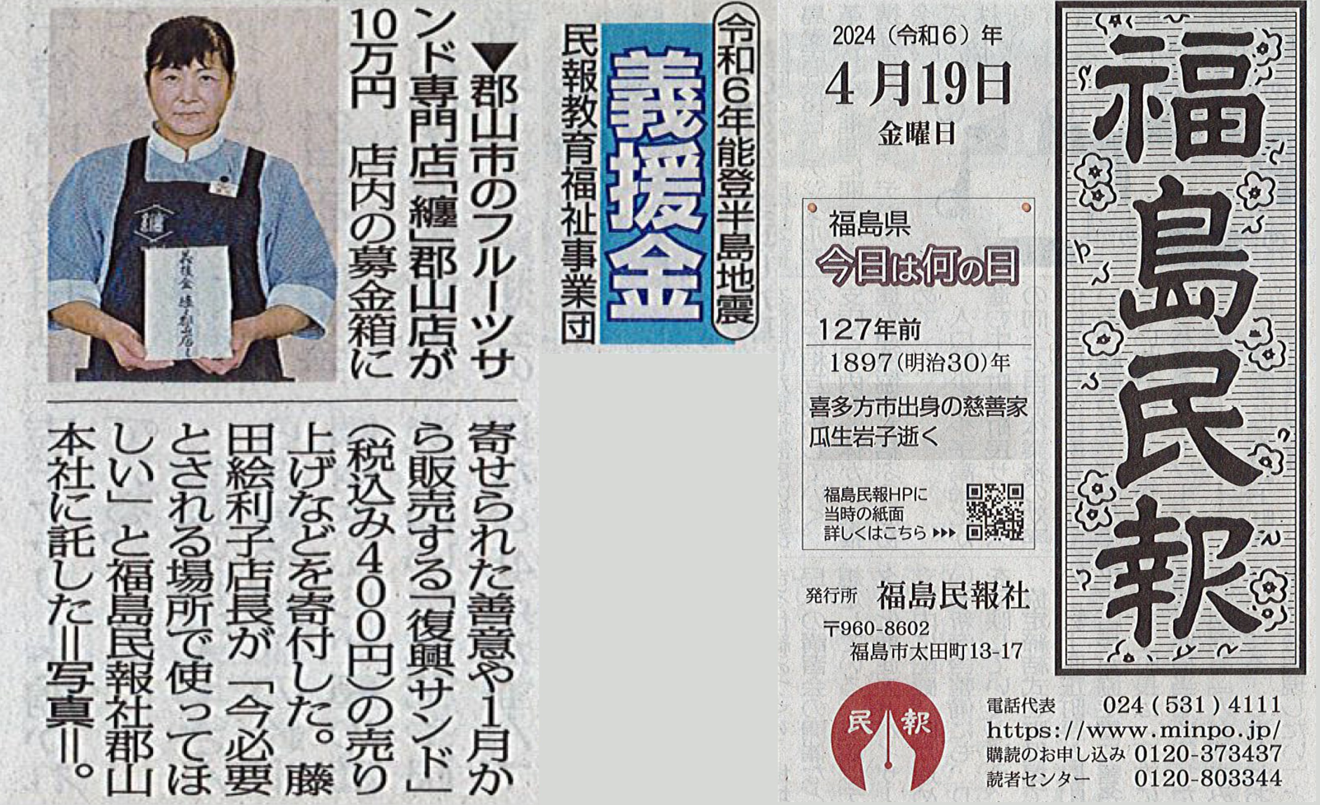 纏~郡山店~が『令和6年能登半島地震』における『義援金』を寄付いたしました。 令和6年4月18日に、『福島民報社 郡山本社』に寄付いたしました。 纏~郡山店~にご来店のお客様のご協力により寄せられた義援金、 合計100,000円 今後、民報教育福祉事業団を通して、被災された方々に届けられます。 皆様の心温まるご支援・ご協力、心より御礼申し上げます。 被災された皆さまが一日でも早く 日常の生活を取り戻していただくとともに、 被災地の復旧・復興を心よりお祈り申し上げます。