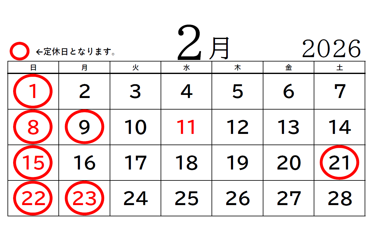 【2026年2月】の定休日をお知らせ致します。